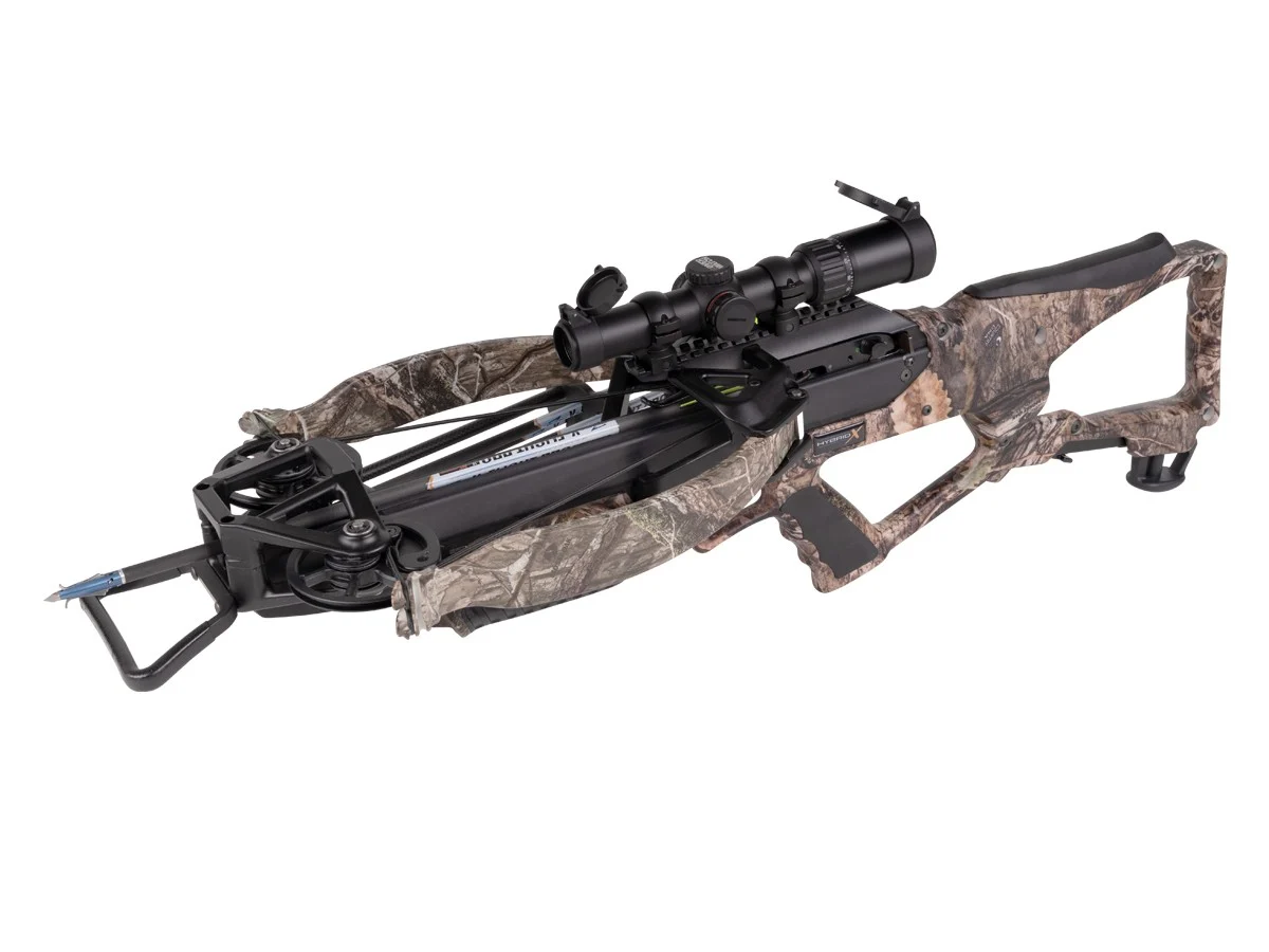 The crossbow allows for easy servicing in the field with just a stringing aid because it doesn’t need a bow press to change the cams or strings, and the dual-anchor limb tips have a groove for a stringing aid to make it easy to tune. The package comes with an Overwatch illuminated scope and 30mm rings, a custom-fit Hybrid X soft case, four V-Flight Pro 18-inch arrows, a Rebolt quiver, and four 100-grain field points.